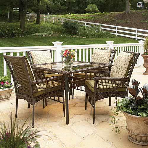 This 5-piece dining set is the perfect addition to any patio. It includes a square table with glass top and four cushioned chairs. It also takes a minimum amount of space providing convenience and style at the same time.