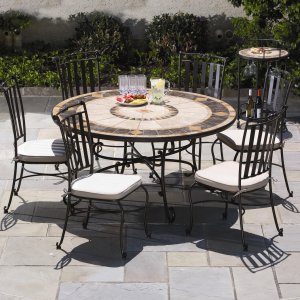 The Compass 60-Inch Mosaic Dining Set is designed for durability and making great impressions. Surrounding this eye-catching mosaic table are six chairs constructed of the highest-quality wrought iron. Choose from dining arm chairs or dining side chairs which feature slat-style backrests and a decorative swirl wrapped around the top horizontal bar.