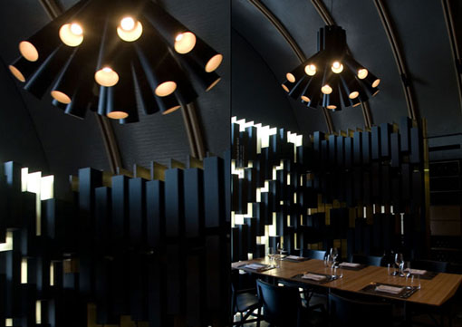 Actually, I don’t like rankings of bars and restaurants in which I haven’t been and tried their signature dishes, but this just looks amazing. This bar-restaurant named “Burgundy” is in Beirut, Lebanon. Look at those lights! They look like slices of transcendental substance, hanging on wooden rods and wires that penetrate the ceiling. These lightweight objects consist of conical tubes, forming the hypothetical realm. By these lights the space is divided into two zones, one under the bar and the other under the dining area.