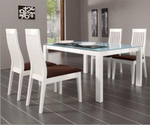 Add some flare to your dining room with the sleek Baron Dining Table and the handsome Chicago Chairs. The glass top extends to provide ample surface space and is as practical as it is attractive. With its simple angled lines, slatted back, and wood veneer frame, the Chicago Chair is a welcome addition to any dining area.