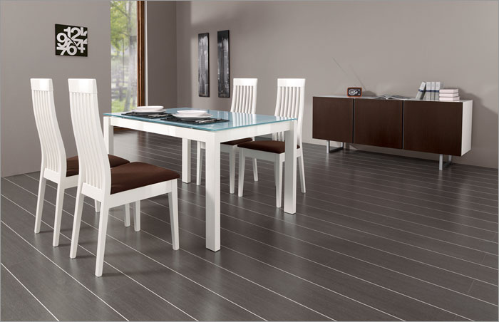 The glass top extends to provide ample surface space and is as practical as it is attractive. With its simple angled lines, slatted back, and wood veneer frame, the Chicago Chair is a welcome addition to any dining area.