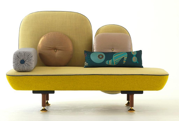 The Loveseat is made of lacquered wood base frame. It has cushions which are covered with colorful Indian textile that includes silk, cotton and wool; and large buttons on each cushion.