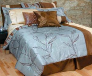 The Breeze Contemporary Bedding Set features a large-scale organic silhouette motif that creates the theme for the bedroom in a cool shade of watery blue, ivory and chocolate brown.