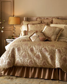 Exquisitely woven European brocade linens inspired by some we’ve seen in France gain sophistication from shades of champagne, pearl, and blush. Lavish trimmings complete the setting beautifully and make your bedroom and bed really one of a kind.