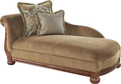 Covered in bronze chenille, the chaise is complemented by both the jacquard print and striped accent pillows. Carved wood base and feet provide stylish contrast. Hardwood frame and coil spring seating provide comfort and support.