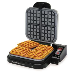 Chef’sChoice®, manufacturers of the worlds finest waffle makers, has created the professional Belgian WafflePro™ #850 for the waffle connoisseur. Revolutionary, super fast and sleek, this waffle maker bakes 4 deep pocket, restaurant style Belgian Lace waffles in 90 to 120 seconds! The advanced design of this unit lets you independently control baking time, temperature and color for novel, delicate, lacy waffles that have a crunchy taste and delicious, home made aroma. The unique Quad Plus Baking System and texture control button gives the option of a fast bake for a crispy exterior and soft, oven fresh interior or deep bake for a more uniform texture throughout. There is no need to flip the waffle maker because the advanced waffle plate flow patterns are especially engineered to fill the plates, ensuring perfectly uniform batter distribution. Other features include a non stick surface, a waffle ready beeper, automatic timer, an easy clean overflow channel and convenient cord storage.