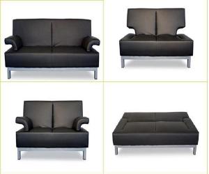 This sofa set offers a wonderful twist on the classic black leather sofa. The three sizes, sofa, love seat and chair, are all able to fold down into flat surfaces.