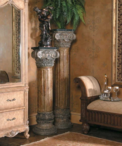 The Corinthian Magesty Pedestal, crafted in cast stone, is a splendid and fully functional piece of art. Its highly stylized and finely detailed capitals have a mix of Corinthian and Ionic influence. The beautiful fluted shafts spring up from an equally stylized base, turning heads and demanding attention.