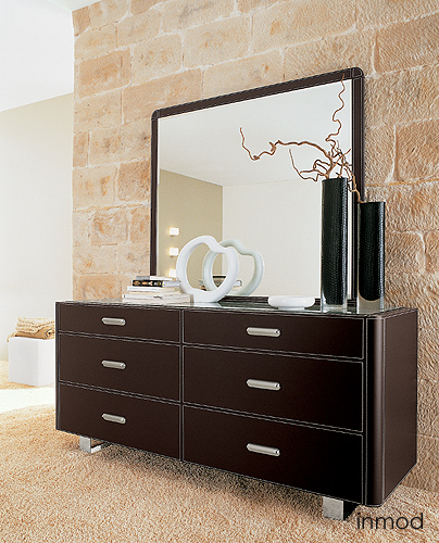 Imported straight from Italy, the Crono Leather Double Dresser Mirror is a sleek, retro design unlike any other! Add this mirror to your dresser as a luxuriant accent piece. A new urban look that works well in any contemporary, retro-modern, or mission-style environment, and will set a modish ambience anywhere. The double dresser mirror is made from solid Italian wood and genuine leather, and features dark chocolate Italian leather with white stitching. Buy the Crono Double Dresser Mirror and enjoy this beautiful piece of furniture that is useful and functional as you can do anything that you wish with it.