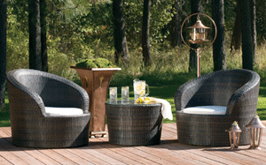 This stately vinyl wicker ensemble comes as a complete set, including two chairs and a table topped with tempered glass. Frames are aluminum, adding strength to stylish design and adding comfort.