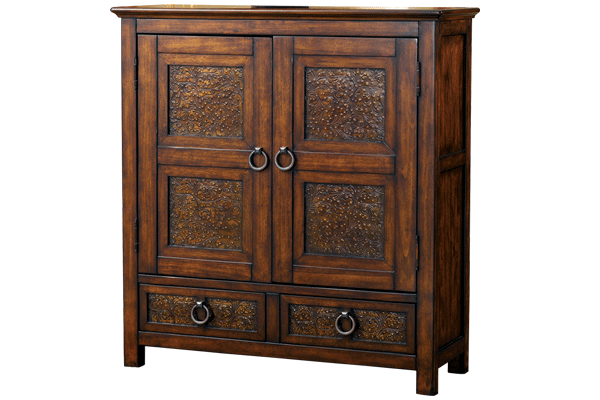 The beautiful dark brown finish is expertly complemented by the sophisticated look of inset stamped metal elements to create the feel of Old World craftsmanship.