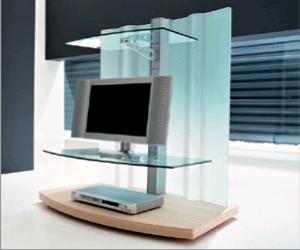 The two glass floating shelves are adjustable, and perfect for smaller sized LCD or plasma TVs. The stainless steel support beam and sturdy whitened oak base are functional and modern.