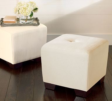 Featuring walnut-stained hardwood legs and a single button-tufted top, the cube can be used as a footrest or for extra seating. Place two together to create a bench at the end of the bed.