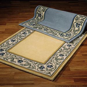 Floral Tibetan Rugs, hand-tufted from wool in India, have solid color fields and matching color frames. Wide, hand-sculpted floral-and-vine border is encased in lines of solid color.