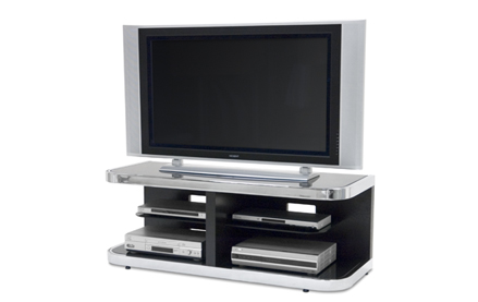 The great thing about this handsome modern-design entertainment unit is all the individualized storage space. Its panels are made of rift-cut white oak veneer, while the shelves come in tempered glass and a black finish.