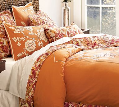Dozens of hand-tied French knots and hand-sewn chain stitches create our bedding’s intricate floral embroidery. Burnt orange cotton duvet cover features ivory flat piping; the sham has a slim ivory flange.
