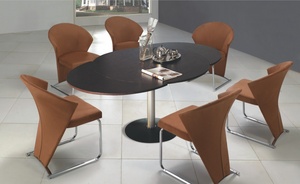 The matching chairs can be added , and embody the meeting of two very different shapes – a modified triangle for the back and a square for the seat.