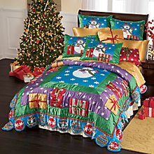Gift-box graphics create a festive border around a cheerful snowman, as a garland of traditional round ornaments decorate the scalloped hem.  Complete the look with snowman shams and distinctive gift-box pillows in two sizes.