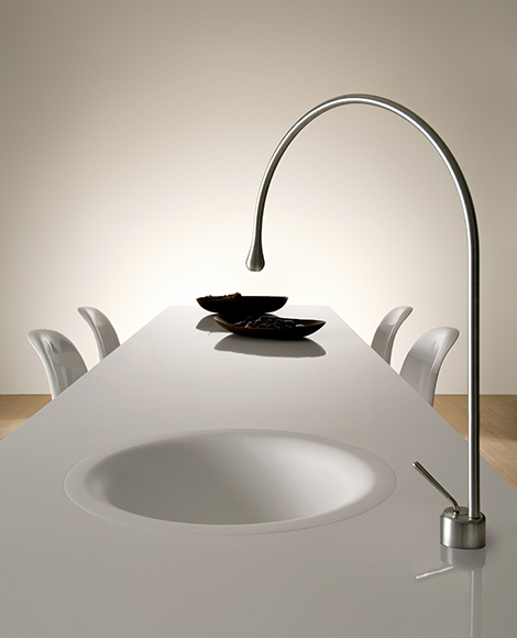 We are all accustomed to that the sink is a necessary attribute of only two rooms at home – the kitchen and bathroom. An Italian brand Gessi in this regard has its own opinion: the novelty of the company is a dining table with Goccia with mounted sink on the countertop that transfers the water source directly into the dining room or even the living room.