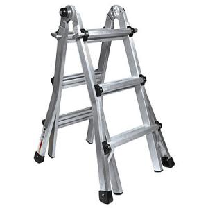 This multi-position ladder features four true functions. They are as follows 1) Super sturdy extension ladder 2) Multiple height scaffold 3) Adjustable height 2- Sided step ladder 4) Versatile stairway ladder. Heavy-duty aluminum construction. Superior locking hinge system. Flared base provides extra stability. 300 lb. Duty rating, ANSI Type IA.