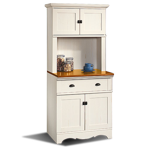 Gourmet Kitchen Unit is constructed of wood with an antique laminate finish. The hutch has a hidden storage behind doors and a board panel. There is also a shelf behind lower doors.