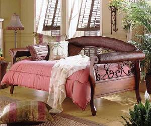 A beautifully arched headboard and rolled arms complement each other perfectly, and are both complemented by the whimsical curves of the inner metal design.