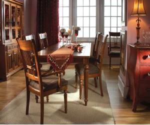 Inspired by European country furnishings, this Hall dining set conveys an old-world ambiance with updated style and function.
