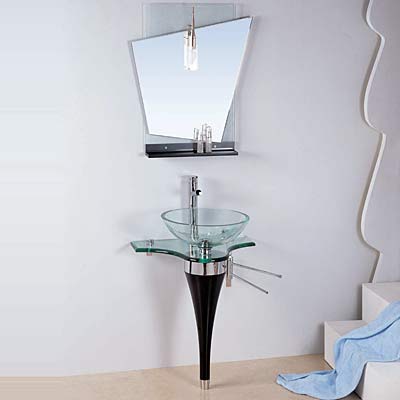 The glass sink and tabletop make no apologies for bearing it all, while the oak transforms the unabashedly modern appeal of this vanity into something with a touch of sophistication.