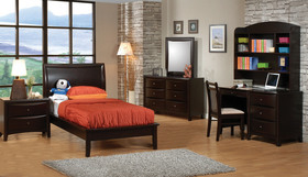 The solid, dark wood twin bed, desk, dresser and night stand are a complete well manicured set with easy opening drawers, supple finish and a well balanced base for safety. A quality set that can be passed down from generation to generation.