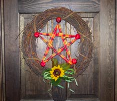 Take the ribbon of sufficient length for the star. Place it on the wreath so as to obtain a star shape. Attach the top stars to the wreath with raffia. The remaining rays of the star can also be attached with raffia or with the help of apples. Usually, artificial apples already have the wire to be easier to mount. If not, then just take a wire and pin the apples on it. You can use glue if you want the apple firmly holds on the wire. Now, simply insert the apples in the wreath. Wrap raffia wreath as in the photo. Several bands or strands of raffia should come down the wreath. Insert sunflowers in the wreath. Your wreath is ready for Halloween!
