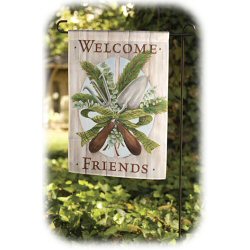 Glitter accents and the text “Welcome Friends” gives this flag a refreshing, pleasing appearance.