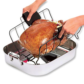 This award–winning roasting rack has a removable pin that lets the design open from the bottom, neatly depositing the turkey exactly where you want it.