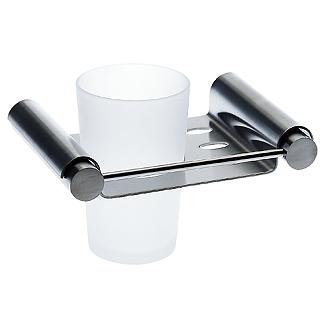 Crafted from pressed glass and corrosion-resistant matte stainless steel, this Glass with Holder is solidly constructed for sound installation and includes holes for holding toothbrushes.