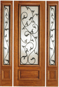 Doors pictured are 96 inches in height. 80 Inch tall doors do not have the wood panel shown on the bottom of the door. These doors have decorative wrought iron inside insulated glass with a sandblasted back gound for your privacy.