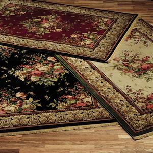 Richly colored Kelmscot Rugs feature fields with one large central bouquet and four lovely corner bouquets of soft roses with greenery.