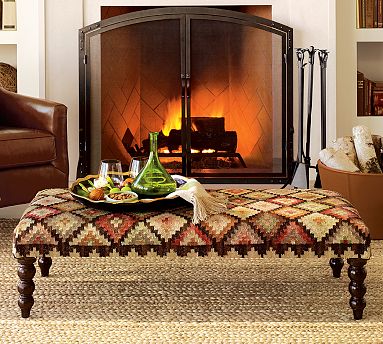 The bold graphics of traditional handwoven kilims bring smart style to this bench. The bench features spool-turned legs that are stained a deep espresso and densely woven wool-and-cotton upholstery.
