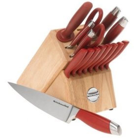 KitchenAid 16-Piece Cutlery Set with Traditional Natural Block, Red Handles