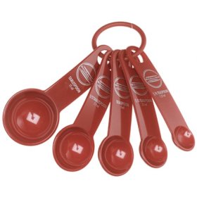 These measuring spoons are made out of high impact resistant ABS plastic, able to withstand the abuse most kitchens can dish out. They all stay together on a ring, which can hang for convenience.Blessed with large, easy-to-read markings, the five measuring spoons in this set make any cook’s work easier. They’re permanently secured by a solid ring, are sturdily made of thick, red plastic, and are dishwasher-safe. The spoons accurately measure 1/4-teaspoon, 1/2-teaspoon, 1-teaspoon, 1/2-tablespoon, and 1-tablespoon amounts. Their handles are slightly curved, making it easier to obtain level measurements in the proper wrist position. KitchenAid says the first year of the spoons’ lifetime warranty against defects is hassle-free; the company will ship a replacement at no cost and without question if a defect is detected. –Fred Brack