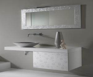 The low, rectangular form is wall-mounted and completely uninterrupted by handles. However, the front panels of the modern bathroom vanity feature a gorgeous floral motif.