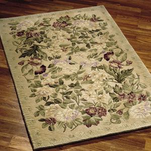 Lavender Garden Rugs are plush, pure wool floorcoverings hand-tufted by skilled artisans in China. Handcarving adds detail to the dense floral and foliage designs on solid champagne grounds.