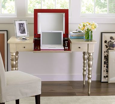 The Leah Desk is ideal for everything from checking email to putting on makeup. The center section of the desk lifts to reveal a beveled mirror.