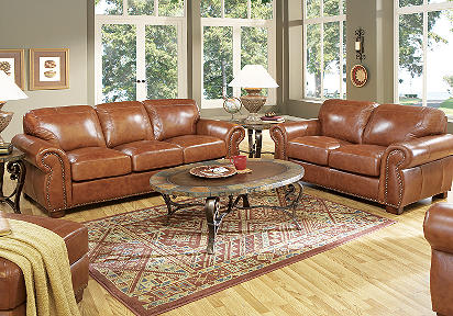 The Phoenix living room blends traditional features with contemporary styling in a rich brandy color with nailhead trim. Other design elements include rolled arms, boxed seat cushions with baseball stitch detail and solid wood feet.