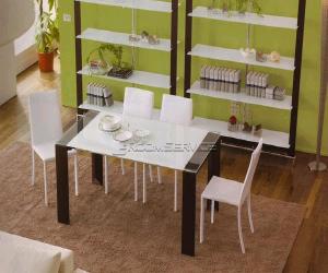 The glass top is painted in white or black while its triangular legs and extension leaf are available in luxurious wenge or warm walnut wood as well as in shiny or matt lacquer in white or black colors. Liko’s legs have triangular satin steel accents placed at an angle on the bottom as if to create an illusion that the table stands on its toes.