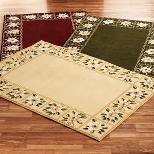 Charming Magnolia Border are machine made in Egypt of polyester/polypropylene. Solid field is bordered by cream magnolias and lush gree Area Rugsn leaves. These soft, durable rugs are .5″ thick.