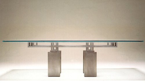Inspired by Oriental proportion and design, this table is defined by the deliberate interplay of positive and negative forms. It is constructed with 3 x 9 metal columns that support a 1in square tube member horizontal grid on which the top rests. Available in polished or satin stainless steel.
