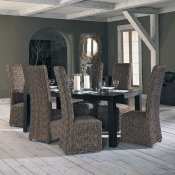 The dining set is from beautiful natural mindi hardwood construction and is fully covered in woven, natural rattan, always looking great and sophisticated. The armless chair design with dramatic high backs and the elasticized fabric spring seats that add comfort are one of the best ones to have in your home.