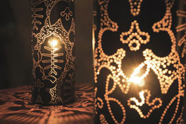 The dramatic Moroccan and Mexican-inspired lantern comes with a removable candle armature that makes candle lighting a snap. It can be set on the ground or hung from a tree, and its finish is perfect for the outdoors.