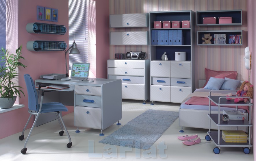 This Modern Girl’s Bedroom Furniture includes Chest of Drawers (set of 2), Shelf Unit, Wall Mounted Cabinet and Desk.