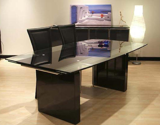 Sleek and ultramodern the Bern Dining Table has an attitude of its own. It is sure to empower any room with its Mongolian Black granite pillars and black glass top.