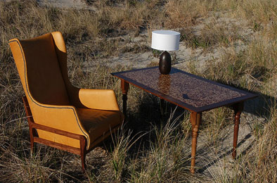 This Mosaic Desk has the indelible imprint of a smoking pipe fixed onto its surface.